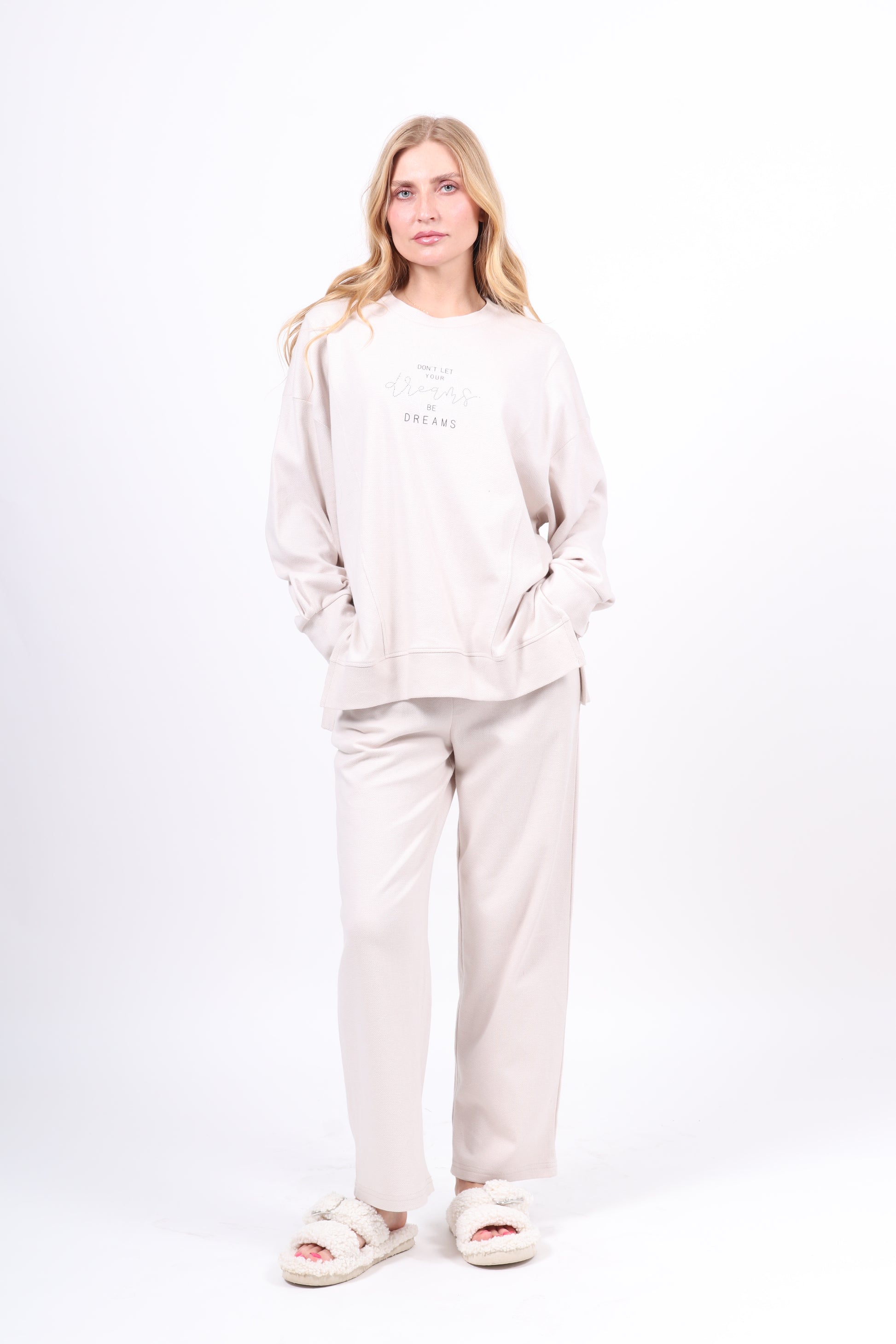 Il se compose d’un pantalon à coupe droite confortable et d’un haut à manches longues, rehaussé d’une écriture imprimée sur le devant qui apporte une touche tendance et décontractée.
