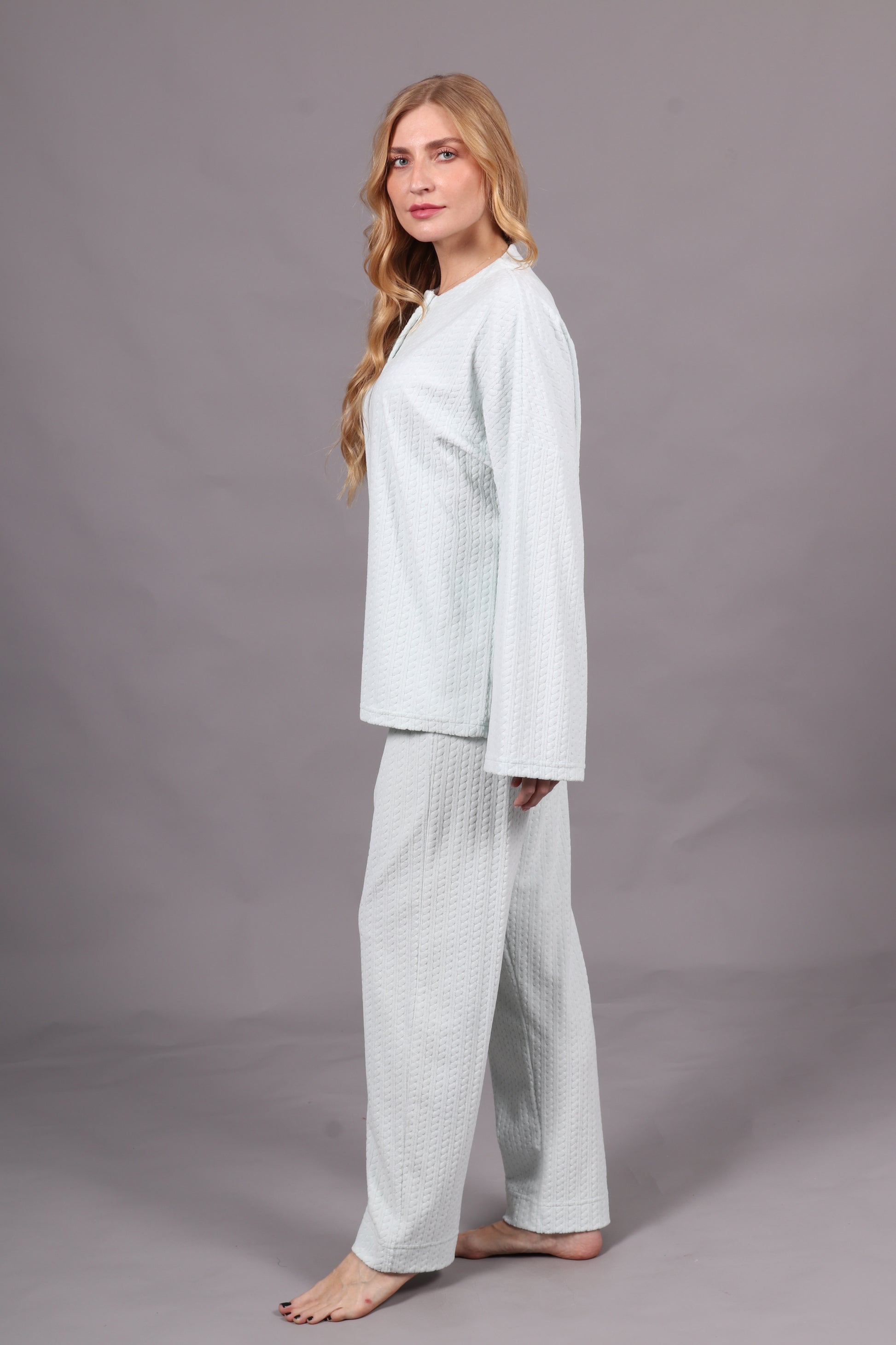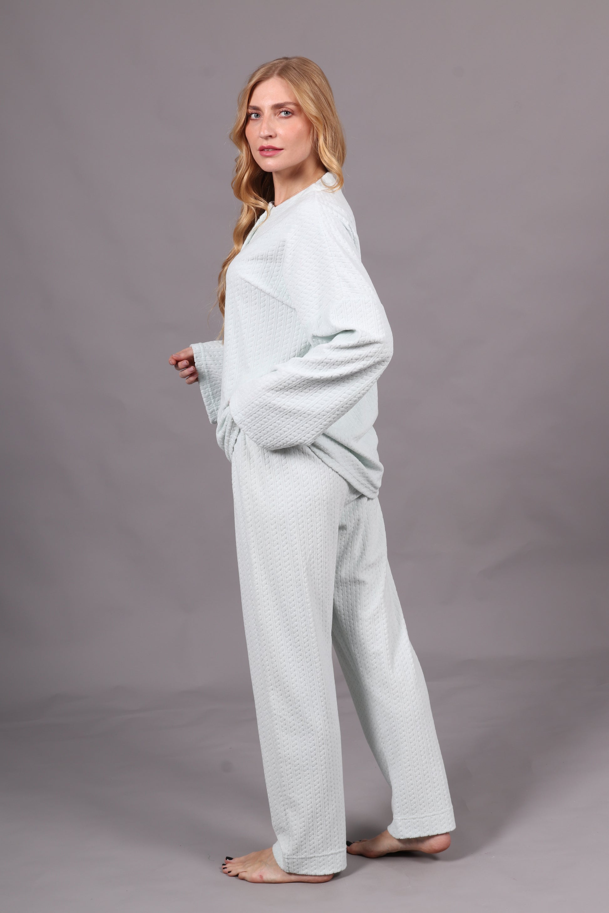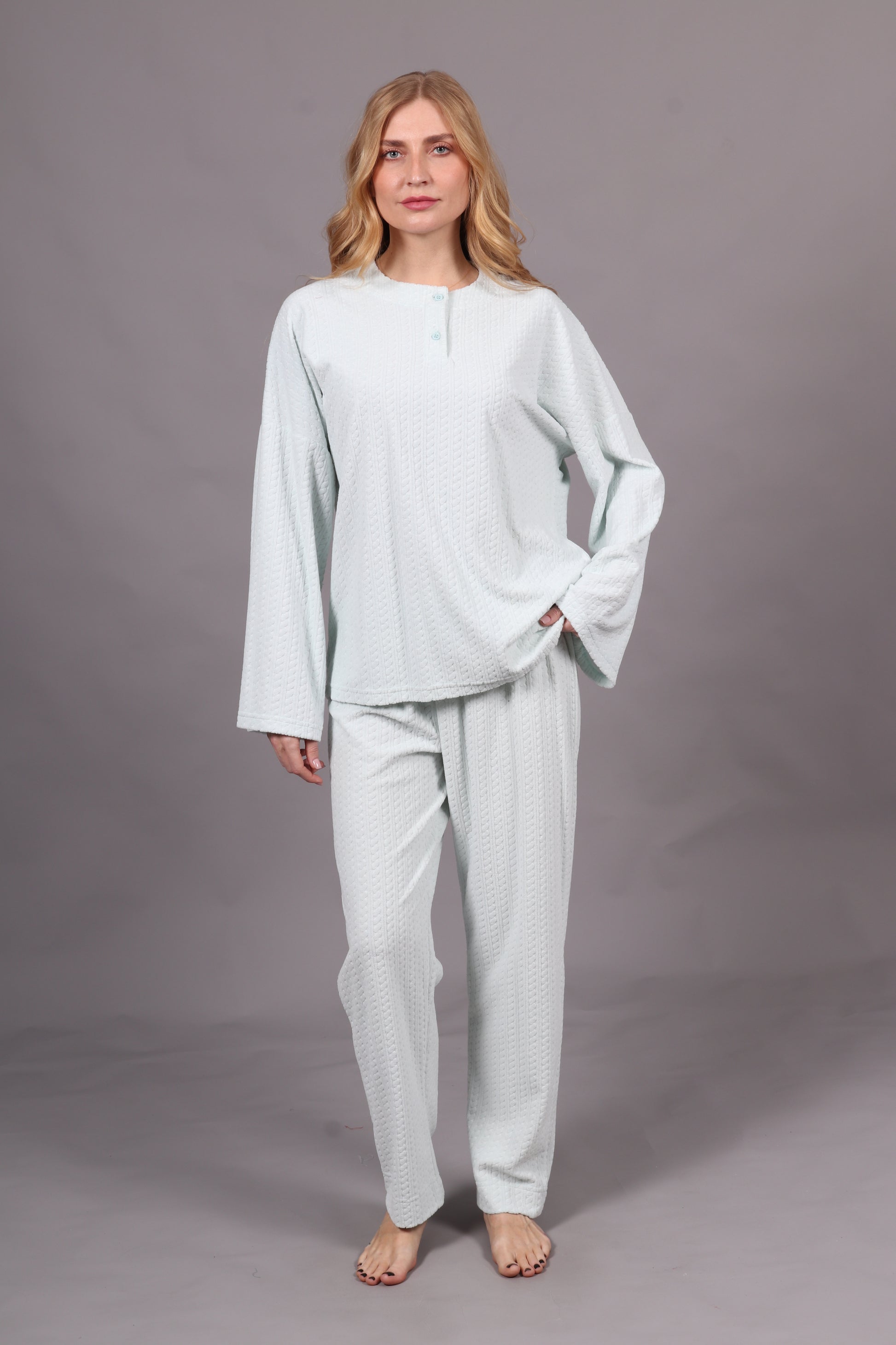 - Pyjama 2 pièces de couleur ciel, avec haut à boutons sur le col et pantalon droit. Un ensemble sophistiqué et raffiné, alliant confort optimal et élégance discrète pour des moments de détente avec style.