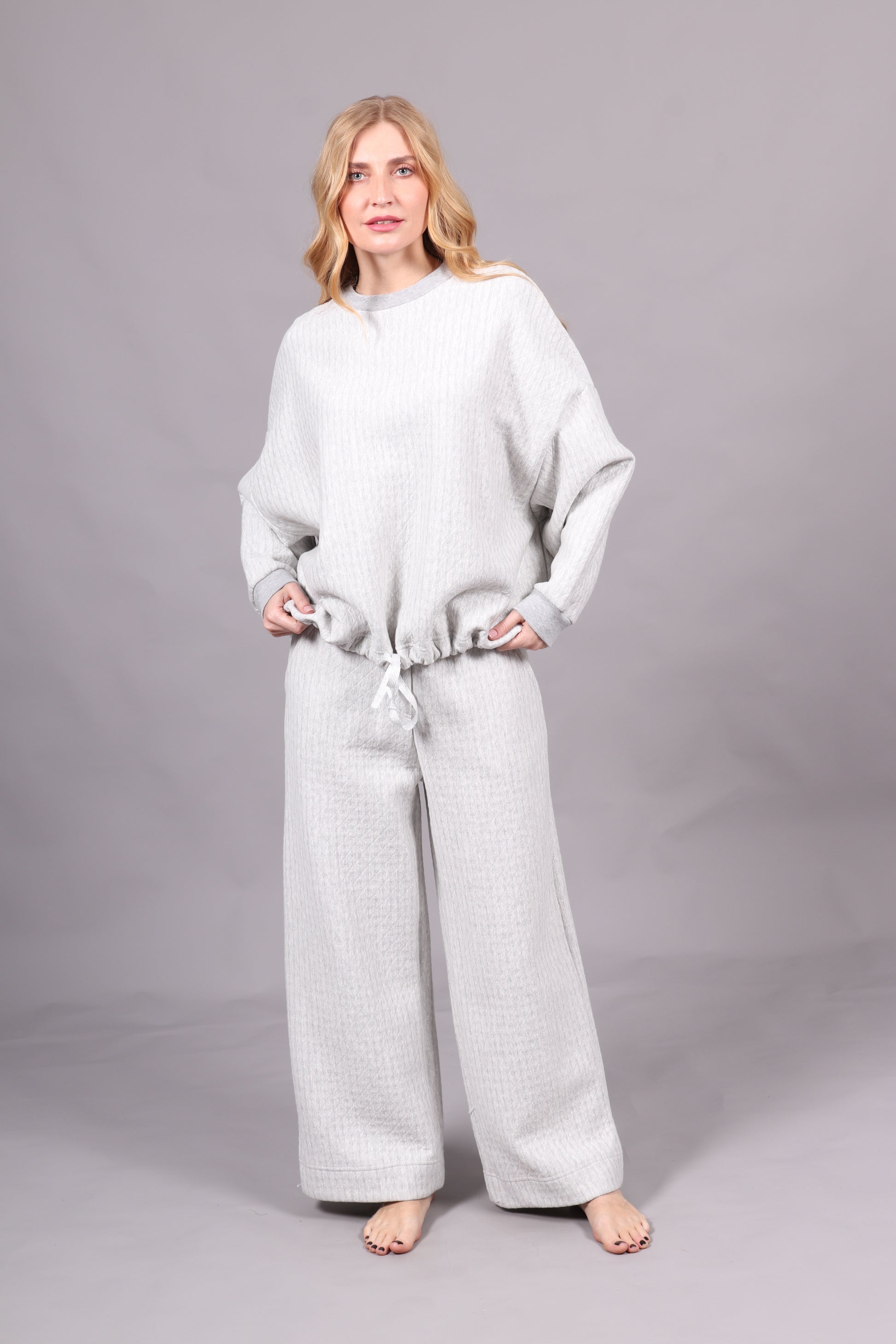 - Pyjama femme en gris uni, avec une coupe oversize élégante. Le haut est cintré au bas pour un effet chic et structuré, alliant confort et sophistication pour un look moderne et raffiné. Parfait pour une détente stylée.