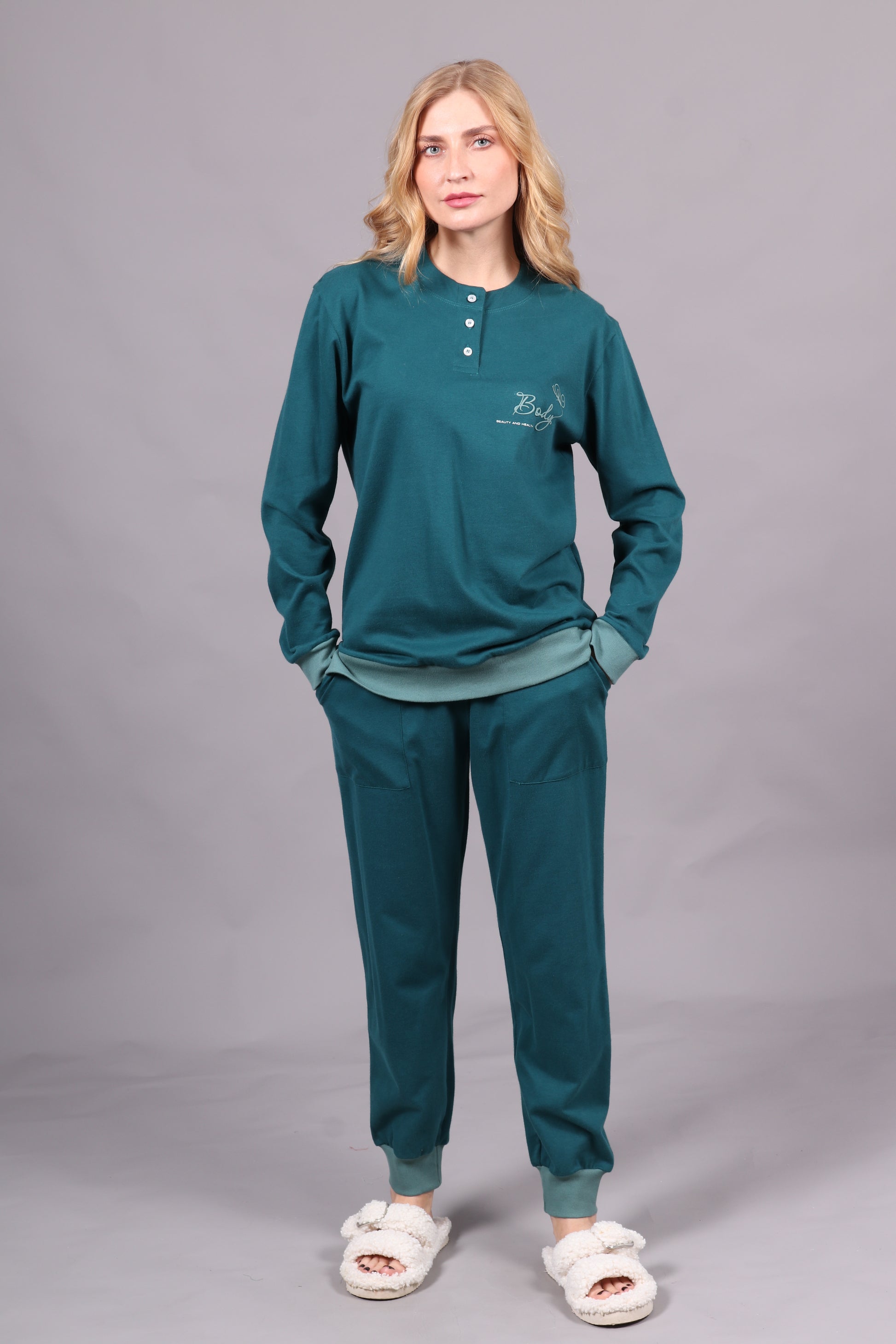 - Ce pyjama femme combine confort et modernité avec sa teinte verte douce, rehaussée de touches délicates de vert pistache sur les côtés. Le haut est sublimé par un imprimé original sur le côté en haut, ajoutant une dimension stylée et contemporaine à l'ensemble. Le bas, simple et épuré, complète parfaitement ce look décontracté et élégant.