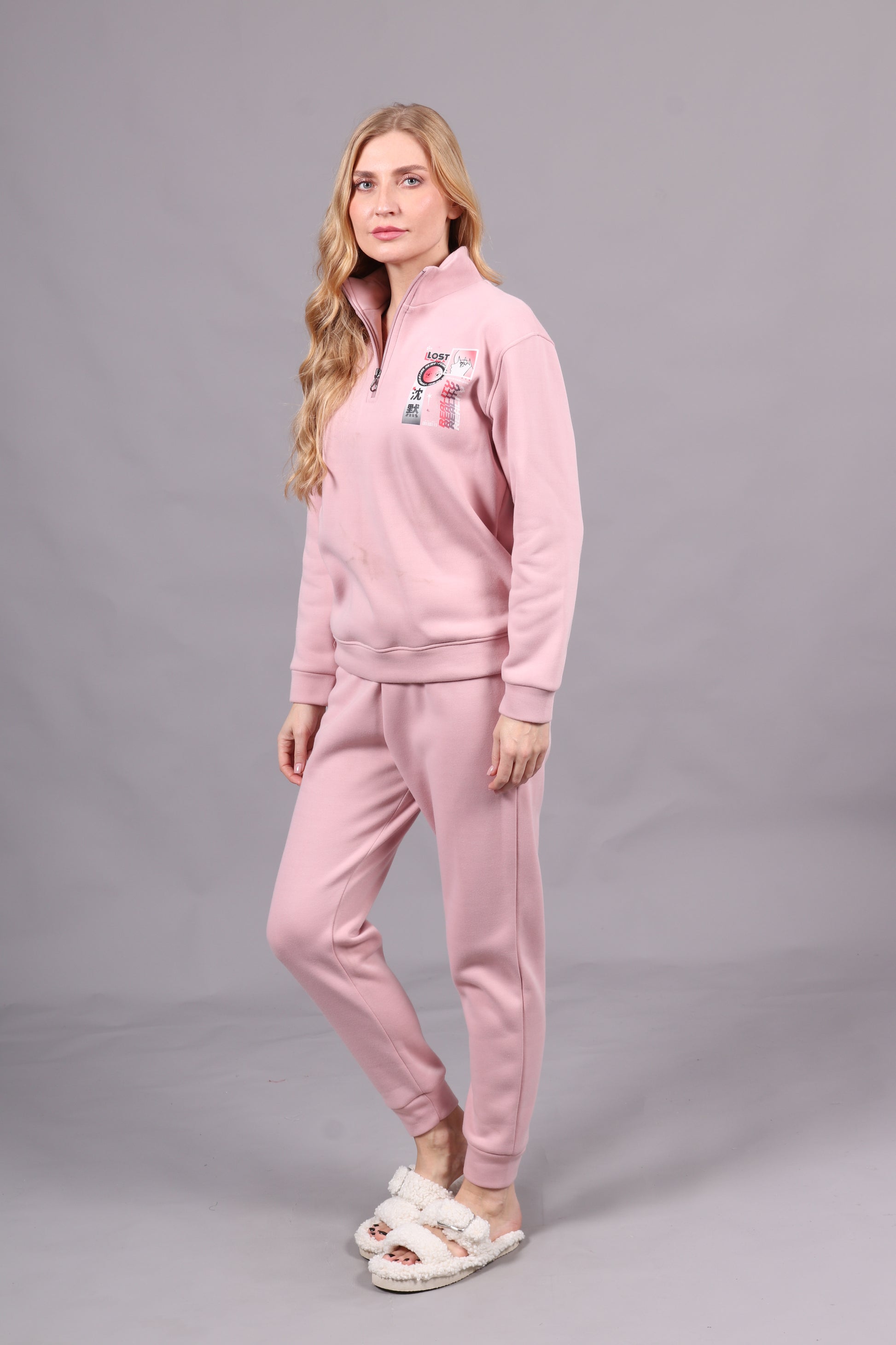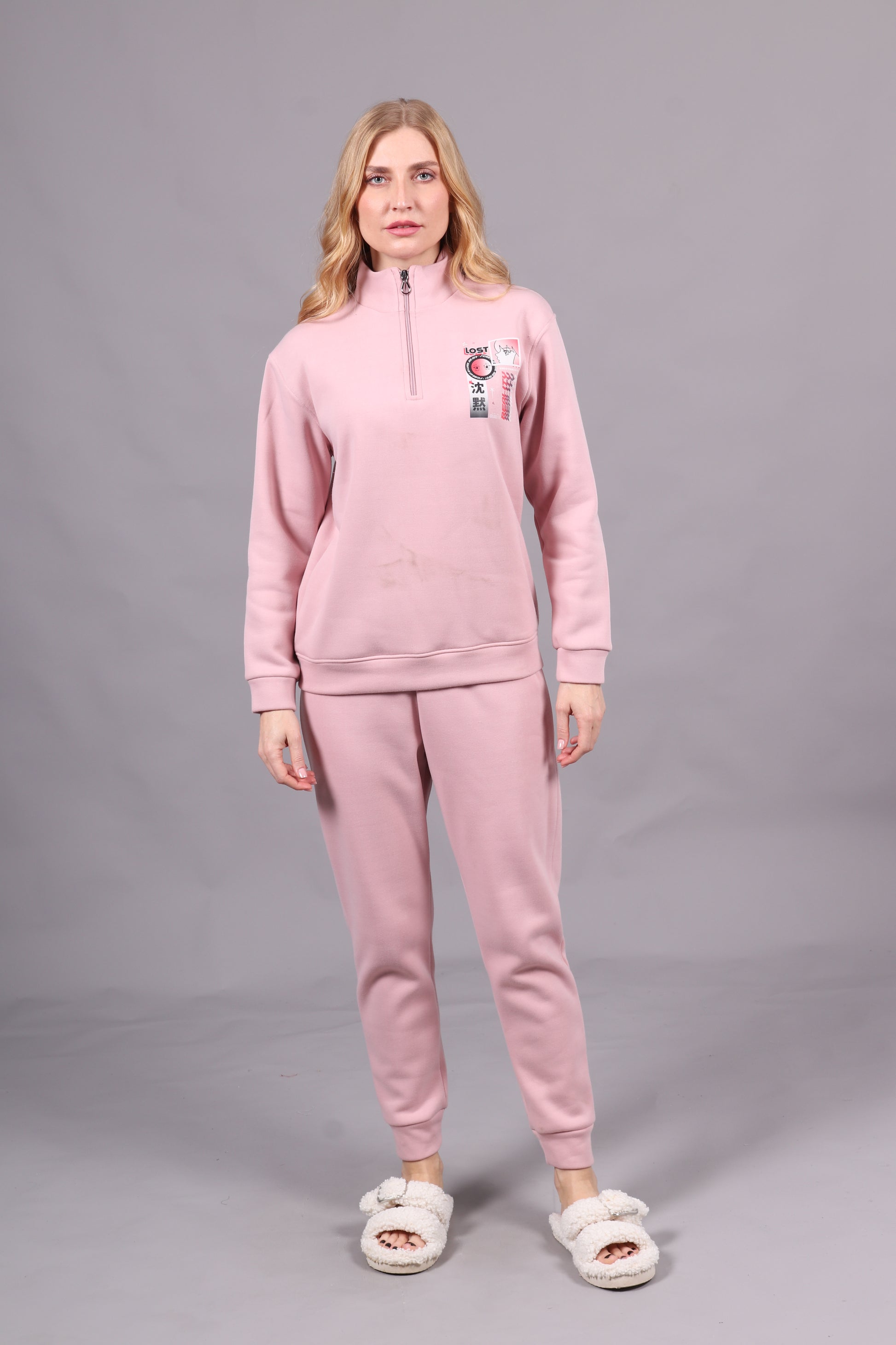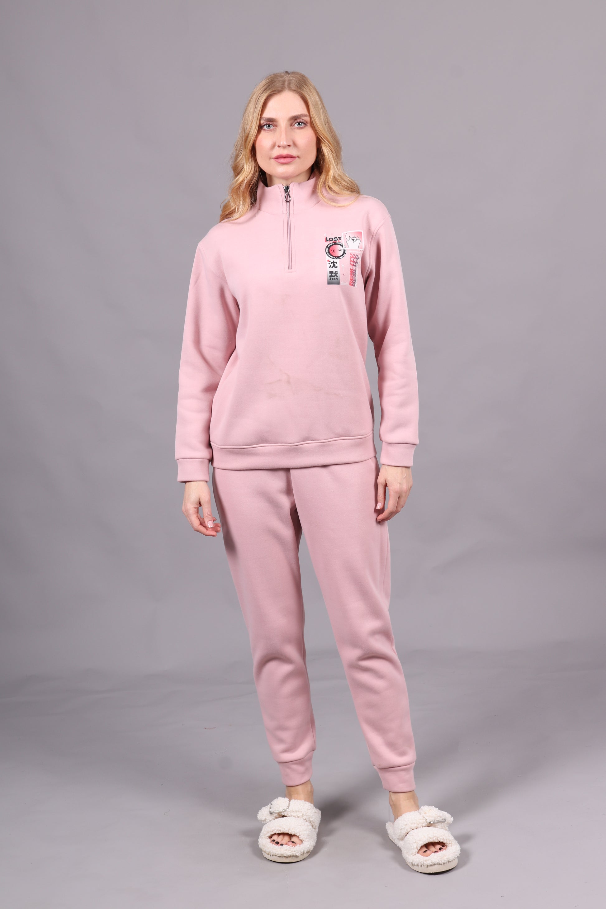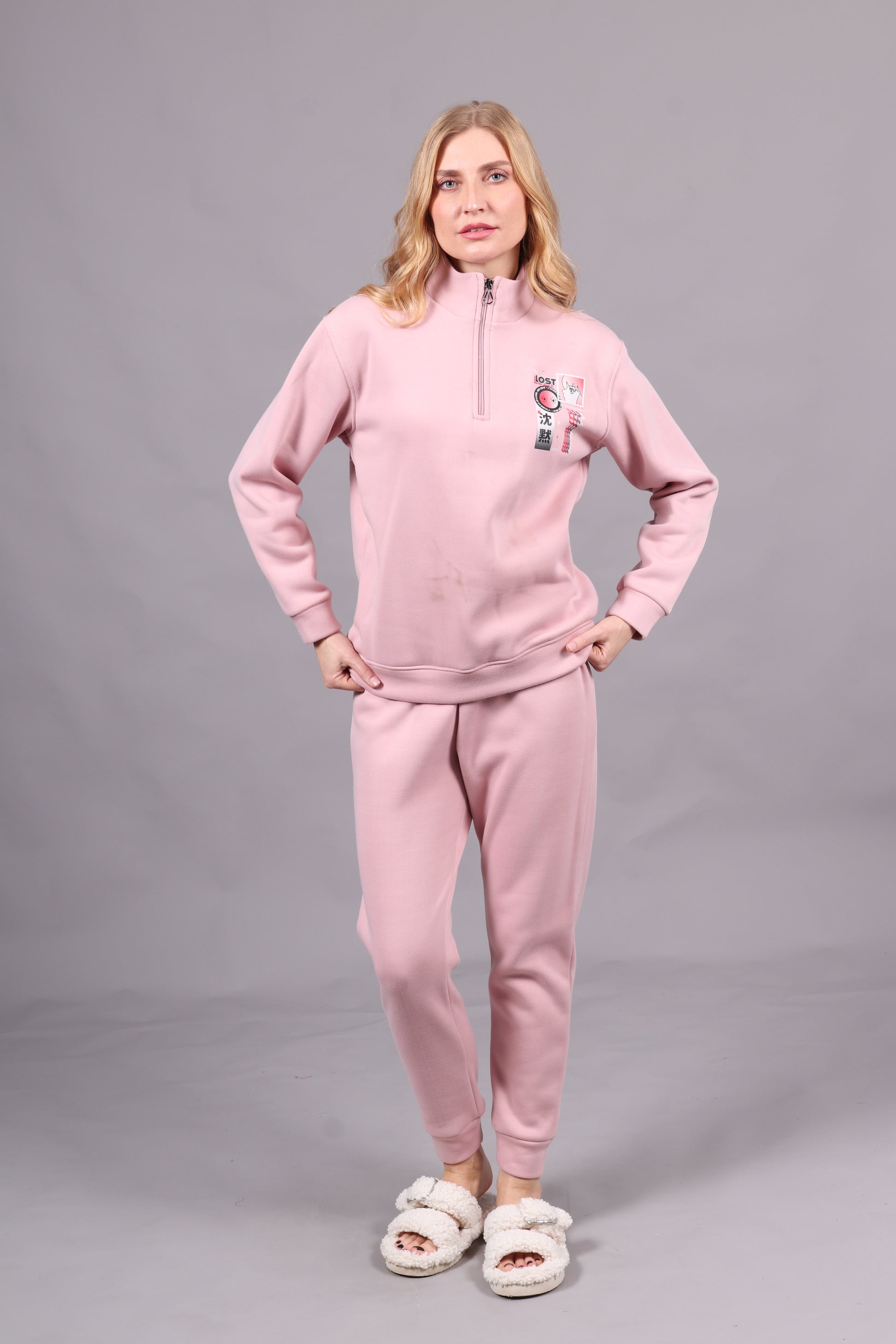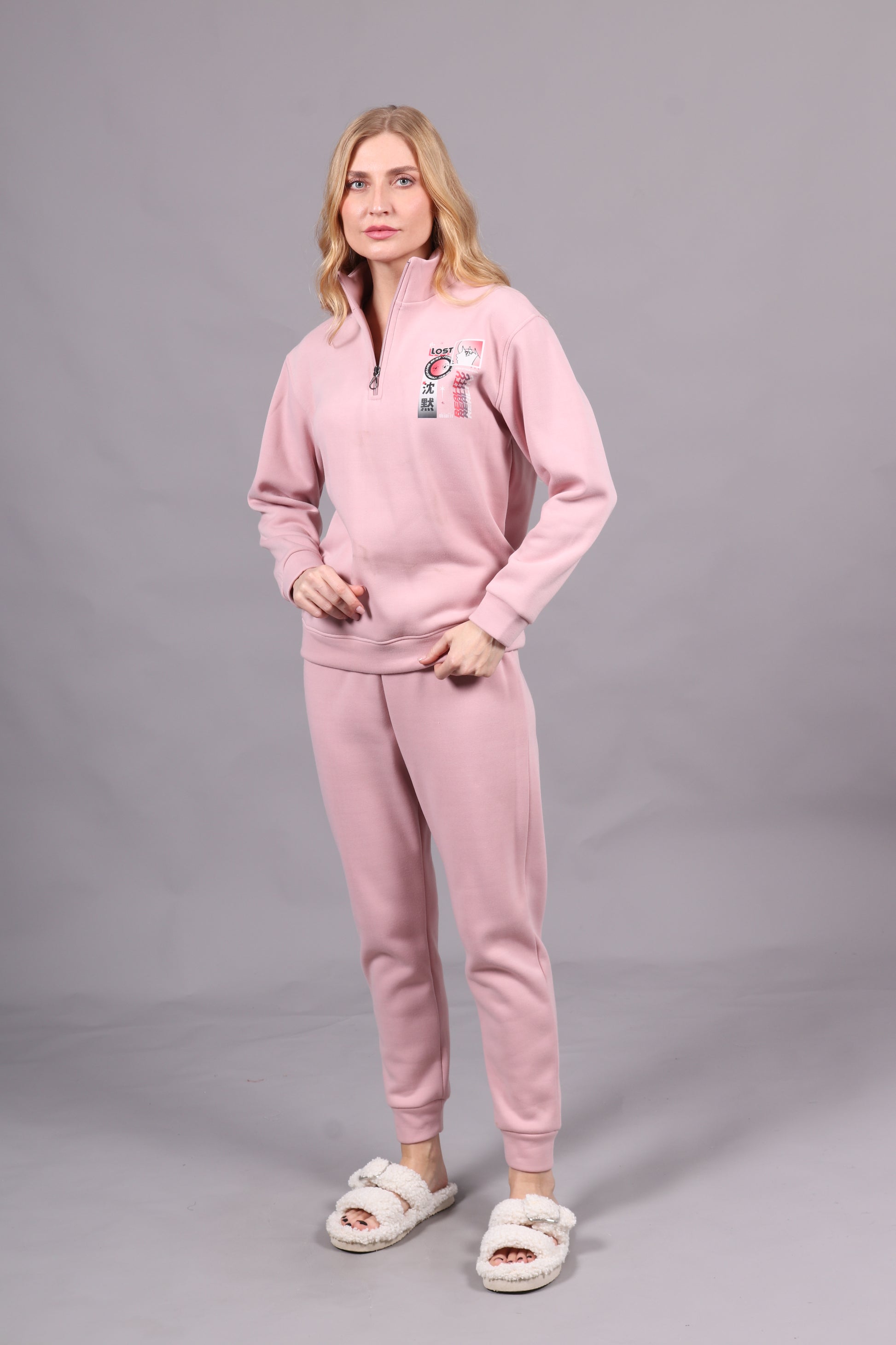 - Jogging 2 pièces avec haut style jacket à demi-glissière et motif, accompagné d'un pantalon serré en côtes. Un ensemble moderne et confortable, idéal pour un look décontracté et dynamique.