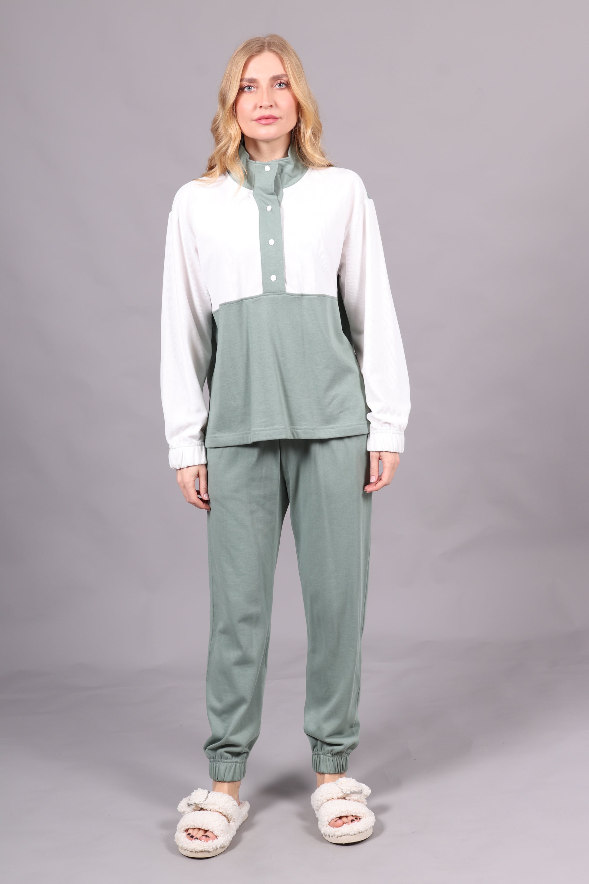- Pyjama femme 2 pièces à dégradé de couleurs vert et blanc, offrant une transition douce et élégante entre les teintes. Le haut, à boutons jusqu'à la moitié, ajoute une touche raffinée et fonctionnelle à l'ensemble. Ce pyjama allie confort et esthétique contemporaine, idéal pour des moments de détente tout en restant chic.