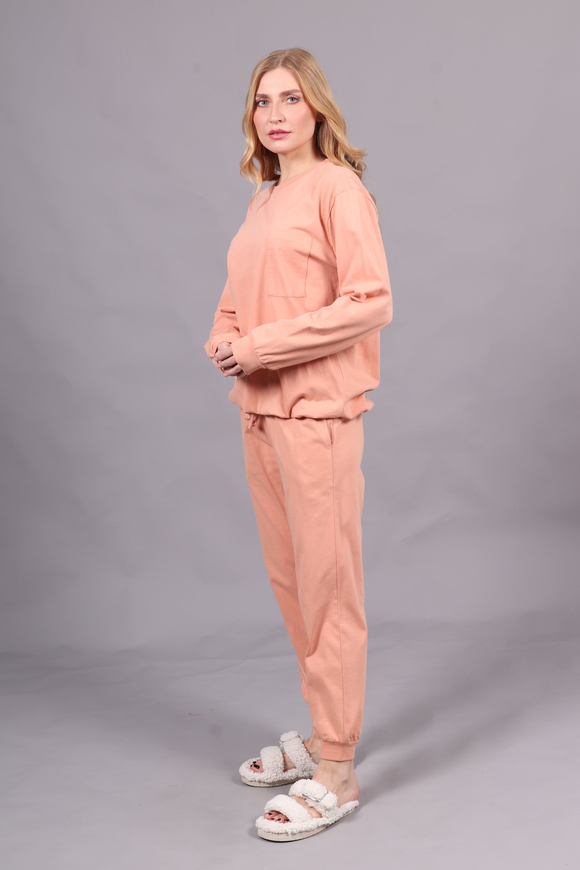 - Adoptez un look sporty et confortable avec notre pyjama effet jogging en saumon. Le haut, équipé d'une poche sur le côté, combine praticité et style, tandis que le pantalon serré aux jambes, avec poches latérales, apporte une touche moderne et dynamique. Parfait pour un confort total tout en restant tendance.